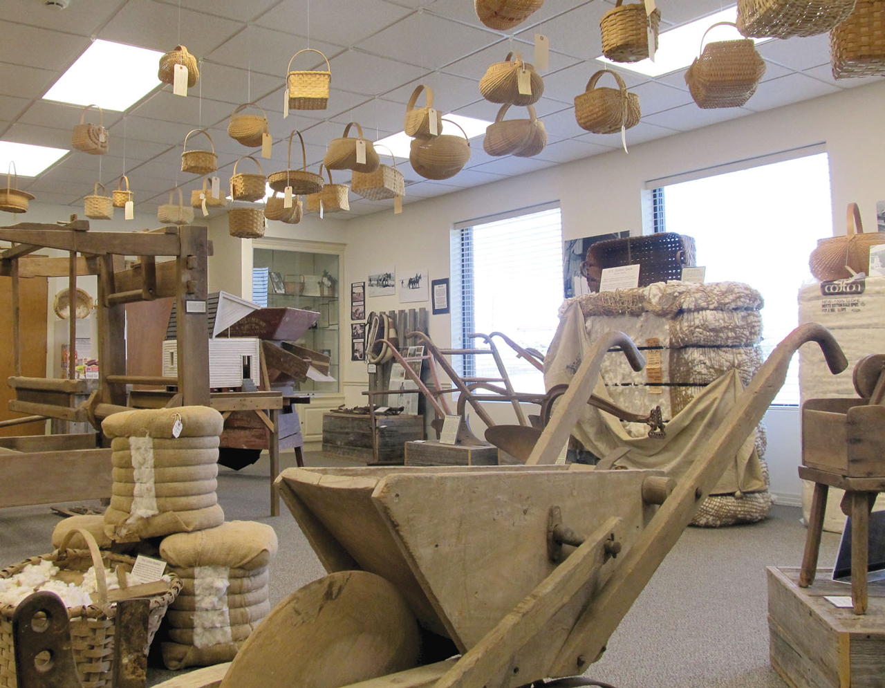 Featured in the Cotton Museum are old plows, fertilizers and planters pulled by mules and horses during the early days of cotton; an old roller gin; and cotton baskets, sacks and scales from when cotton was picked by hand. This museum also features the White Oak Basket Collection, a unique assortment from the collection of the late Newman Walpole.